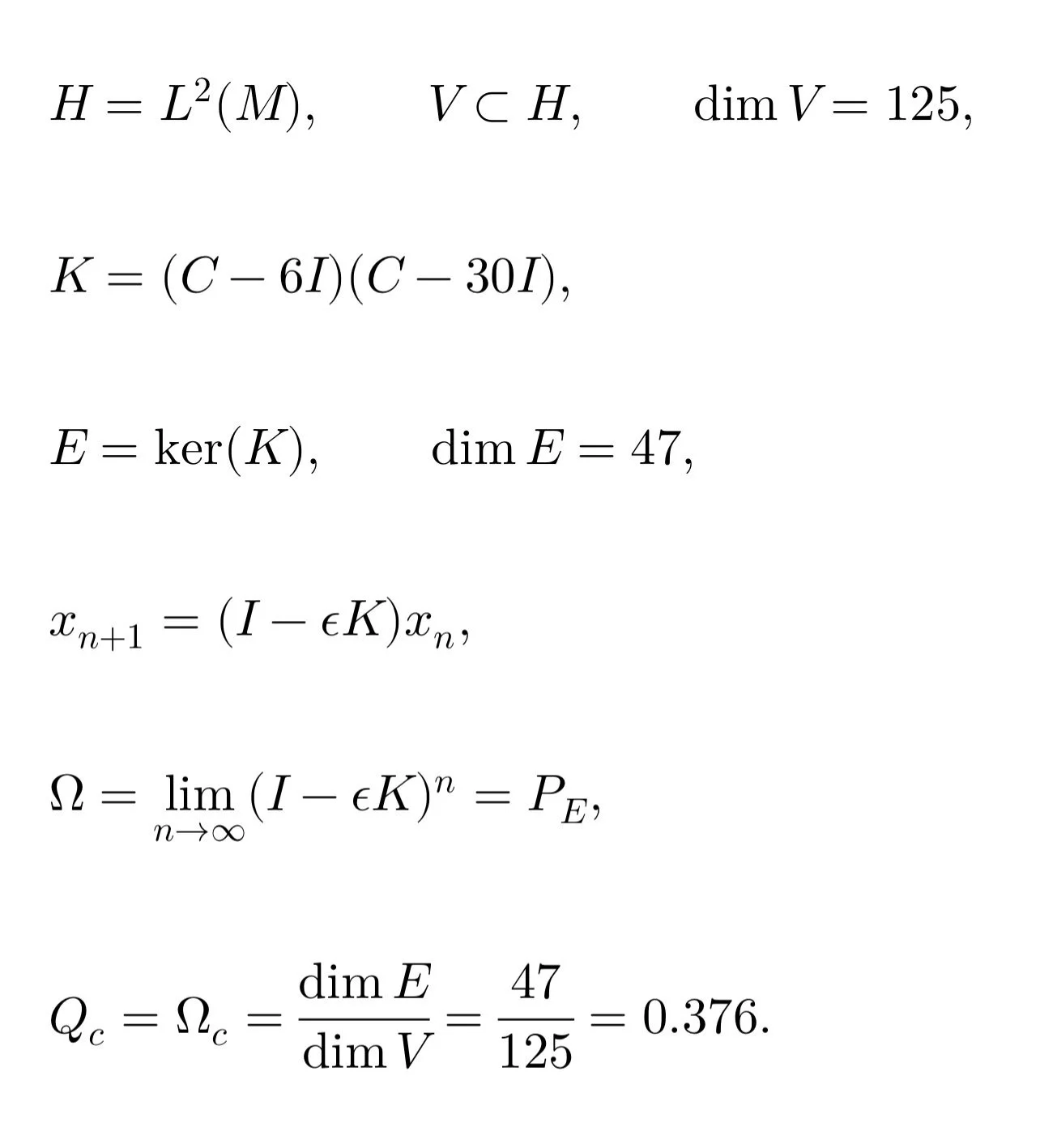 - Consequently \(\ker K=E_6\oplus E_{30}=E_{47}\), and the range of \(K\) lies in \(E_0\); the associated spectral projector \(P_K\) onto \(\ker K\) satisfies \(P_K^2=P_K\) and \(KP_K=0\), so the 47‑dimensional kernel is invariant and globally attractive under any \(K\)‑driven flow.[1]