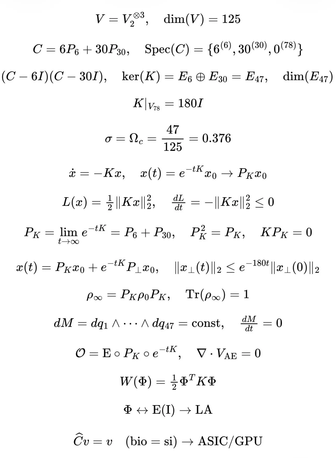 - Because every vector \(x\in V\) can be written uniquely as \(x=P_Kx+P_0x\), and the dynamics annihilate the \(P_0x\) component asymptotically while leaving \(P_Kx\) untouched, the construction achieves a universal reduction: all admissible dynamics driven by \(K\) collapse onto the same 47‑dimensional invariant kernel defined solely by the spectrum of \(C\), with no dependence on microscopic details of the initial condition.[1]