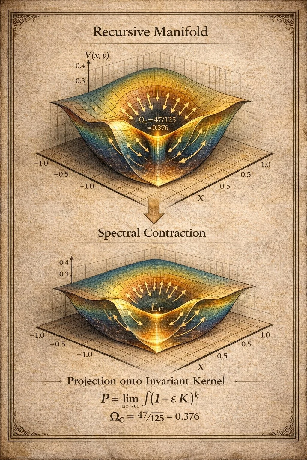 - The invariant kernel has fixed dimension 47 inside the 125‑dimensional space, giving a universal spectral fraction \(\Omega_c=\operatorname{Tr}(P_K)/125=47/125\), which is independent of the initial state and thus a structural constant of the collapse architecture.[1]